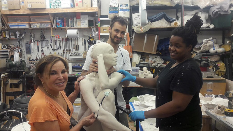 Escultora Carole Feuerman e seus assistentes montando o molde tirado sobre o corpo da modelo, 2016 (Foto:Wikimedia Commons / Autor: Hartt.C2b1)