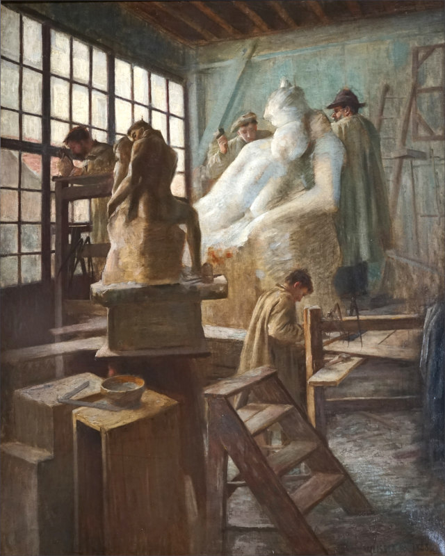 Ateliê de Rodin, óleo sobre tela de Charles L.A. Weisswem 1888. Vemos assistentes trabalhando no mármore ampliado de “O beijo”. (Imagem:Wikimedia Commons)